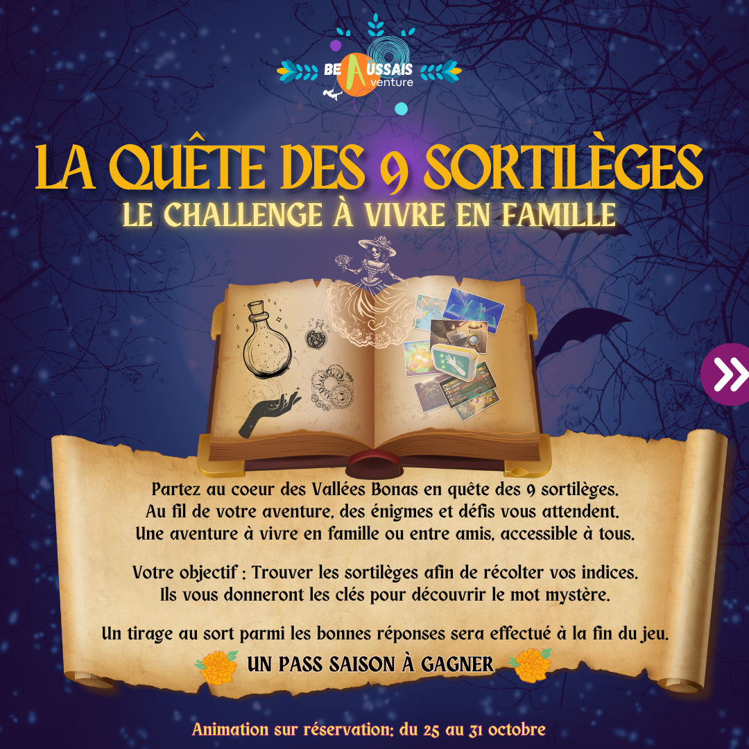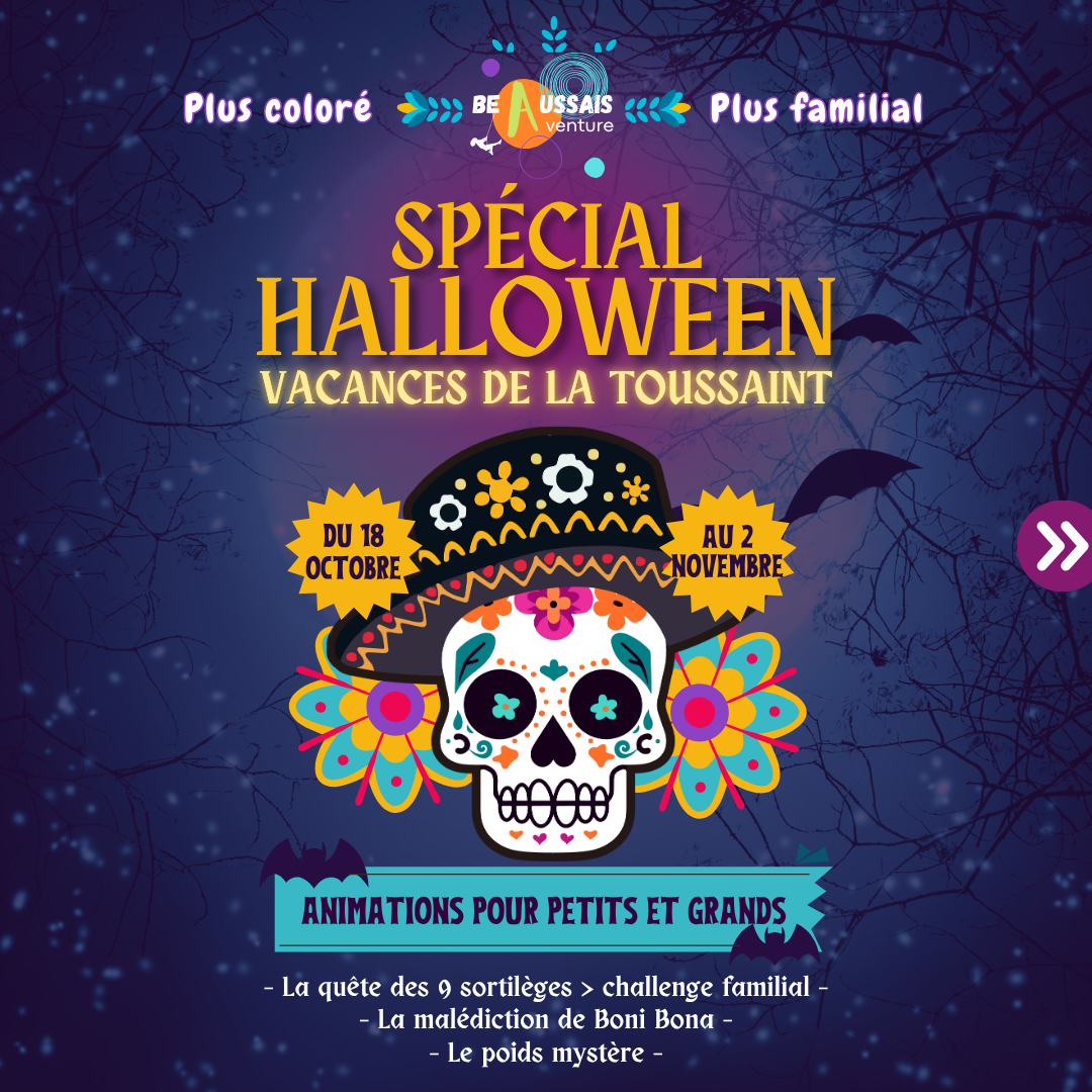 Comme chaque année, Beaussais Aventure se pare de couleurs automnales 🌿🍂🍁🍃. A chaque saison, son ambiance ! L’occasion de vous préparer des animations pour les vacances de la Toussaint: Halloween mais pas que 😉 ! Voici le programme pour profiter d’activités en famille durant les vacances de la Toussaint. RDV sur l’onglet « réserver » pour profiter des animations.