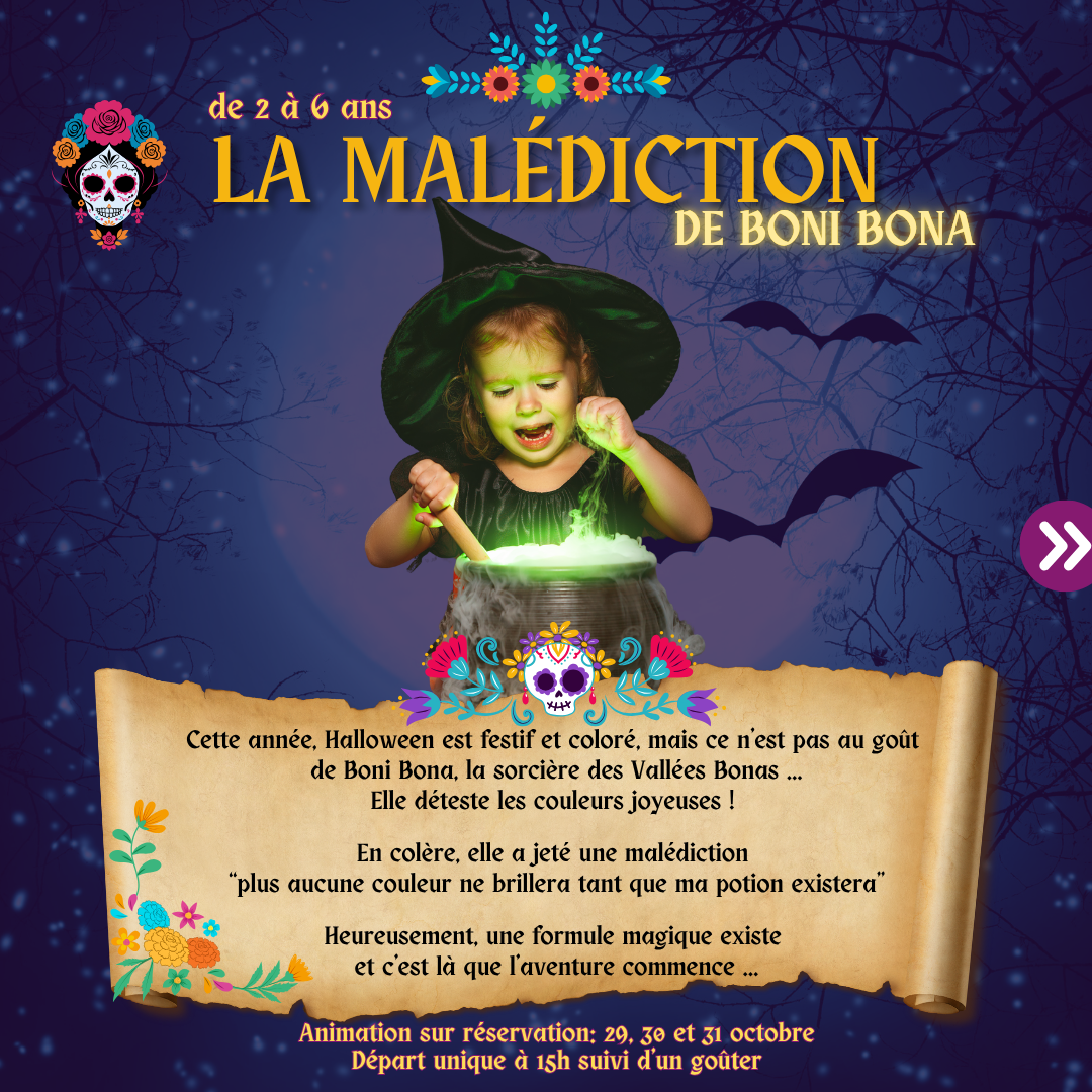 Cett année, Halloween est coloré… Et ce n’est pas au goût de Boni Bona, la sorcière des Vallées. En colère, elle a décidé de jeter une malédiction…Enfilez vos baudriers pour nous aider à découvrir la formule magique et contrer la malédiction.